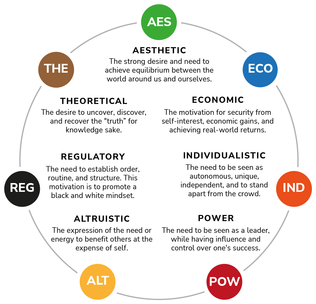 The Motivators assessment offers an in-depth identification and exploration of seven dimensions and how they uniquely combine to influence behavior, decision, and actions: